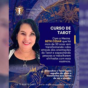 O curso acontece em 3 aulas. O curso inclui os arcanos maiores e menores. Na última aula já é possível realizar a leitura do tarot, pois a prof.ª Beth Cesar trabalha com um método simples de aprendizado. Beth César não é apenas uma professora, mas mestra no Tarot com 30 anos de experiência. Além de ser uma pessoa alinhada, é um canal confiável para o ensino mais profundo do Tarot. Esta ferramenta sagrada, que serve não só para o auto conhecimento, mas também para a transformação e cura em todos os níveis do ser.